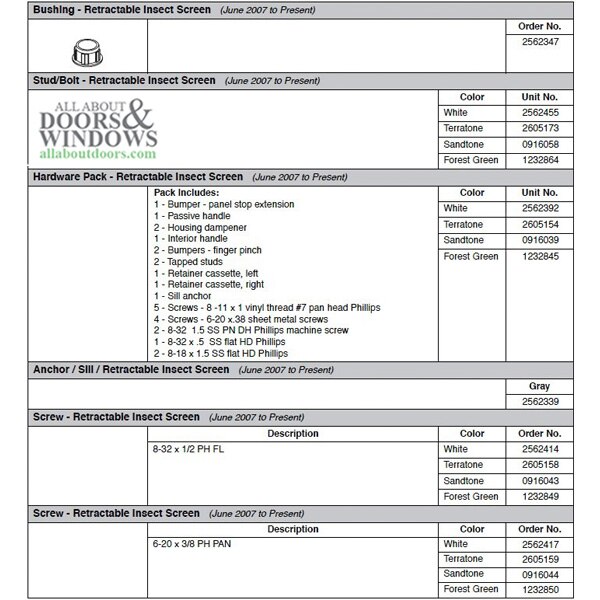 Andersen Frenchwood Gliding Doors - Bushing - Retractable Insect Screen Part Number: 2562347 Price: $1.87 Quantity discounts available QuantityPrice Quantity: Each-+ Add to Cart DescriptionAdditional InformationAndersen Frenchwood Gliding Doors - Bushing - Retractable Insect ScreenRelated Andersen Parts:2562347 - Bushing - Retractable Insect ScreenSold Individually