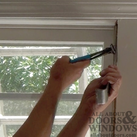 - Use two flat pry bars to get in-between the stops and the window frame. Carefully work your way down the length of the window to loosen the stops. the stops are nailed in and should easily pry off, but work carefully and slowly to prevent breaking the stops. You will need to reuse them after you install the new window. The side stops come off first, then the top the top.