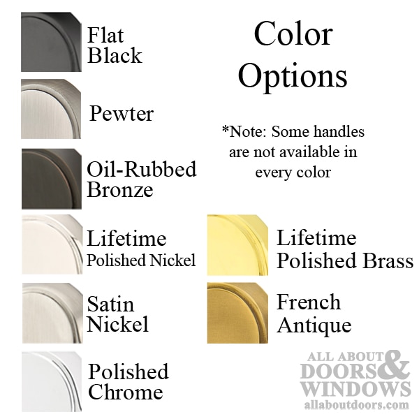 See images for options. Please note that some handles are not available in every finish. Color/Finish selection will apply to both backplate and handle
